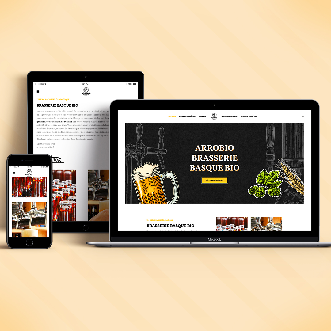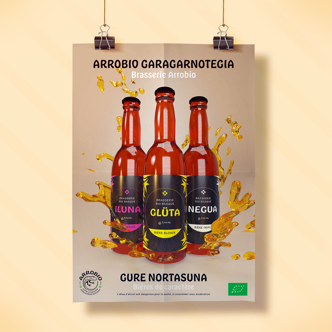 Création de l’identité visuelle de la marque Arrobio, Brasseurs Bio à Espelette. Conception du logotype, packaging produit, étiquettes produit, plaquette commerciale, vidéo promotionnelle.